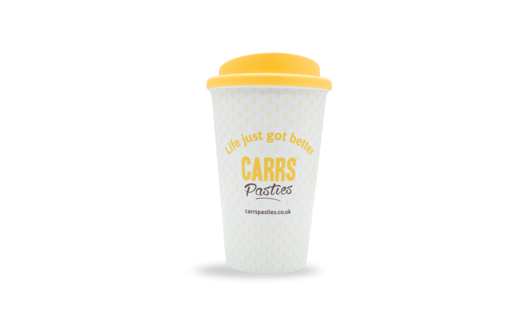 Plastic reusable travel mug with Carrs Pasties branding. Perfect for enjoying a hot drink on the go.
